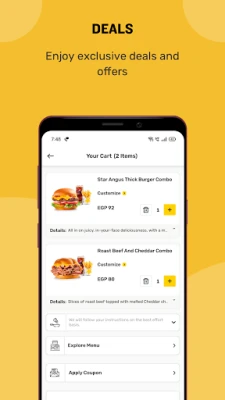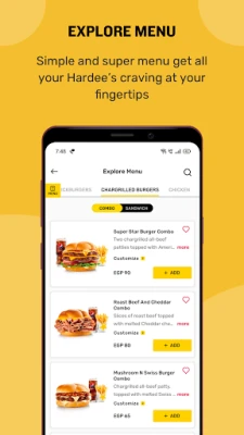 Hardee's Egypt นำเสนอทางเลือกที่หลากหลายไม่รู้จบ เพื่อตอบสนองทุกความต้องการ ไม่ว่าจะเป็น Angus Thickburgers® อันเป็นเอกลักษณ์ เบอร์เกอร์ไก่ย่างถ่านรสเลิศ แซนวิชสเต๊กฟิลลี่ชีส หรือเบอร์เกอร์เนื้อฟิลเลต์ นอกจากนี้ยังมีเมนูเครื่องเคียง ของหวาน และเครื่องดื่มที่คัดสรรมาอย่างดี รวมถึงชุดอาหารสำหรับเด็ก และชุดสุดคุ้มที่ตอบโจทย์ทุกความต้องการ และหากคุณต้องการสร้างสรรค์มื้อโปรดในแบบของคุณเอง ฟังก์ชันการปรับแต่งในแอป Hardee's Egypt ก็ช่วยให้คุณเพิ่มท็อปปิ้งและเครื่องปรุงรสได้ตามใจ ให้ทุกคำเป็นไปตามที่คุณต้องการ
